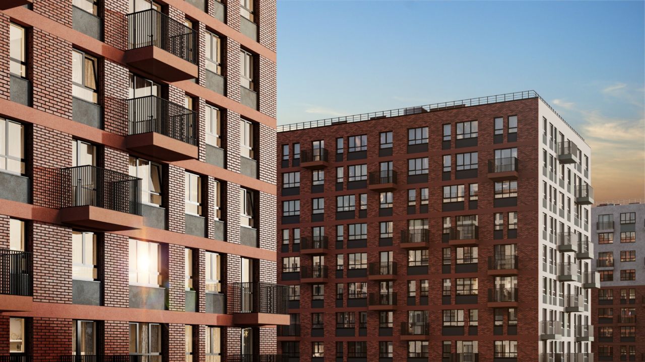 В палитре фасадов можно разглядеть оттенки рассветного неба: терракотовый, персиковый, песочный. Облицовку корпусов мы выполним из декоративной штукатурки и кирпича.
